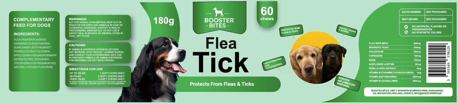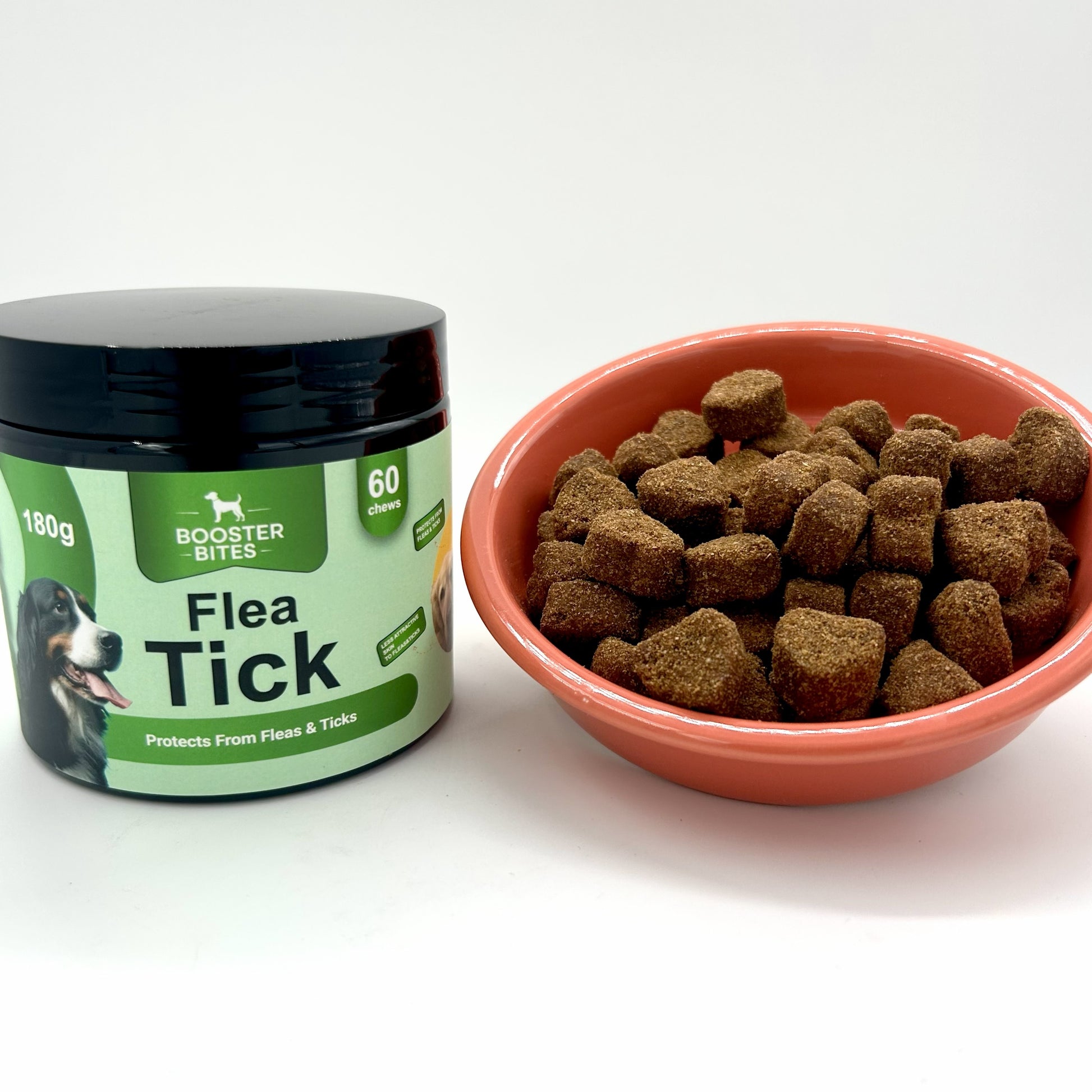 Fleas and ticks can cause constant itching, discomfort, and even transmit diseases. Booster Bites: Flea & Tick chews are a natural daily supplement designed to make your dog less attractive to parasites, while also supporting their immune system and skin health.