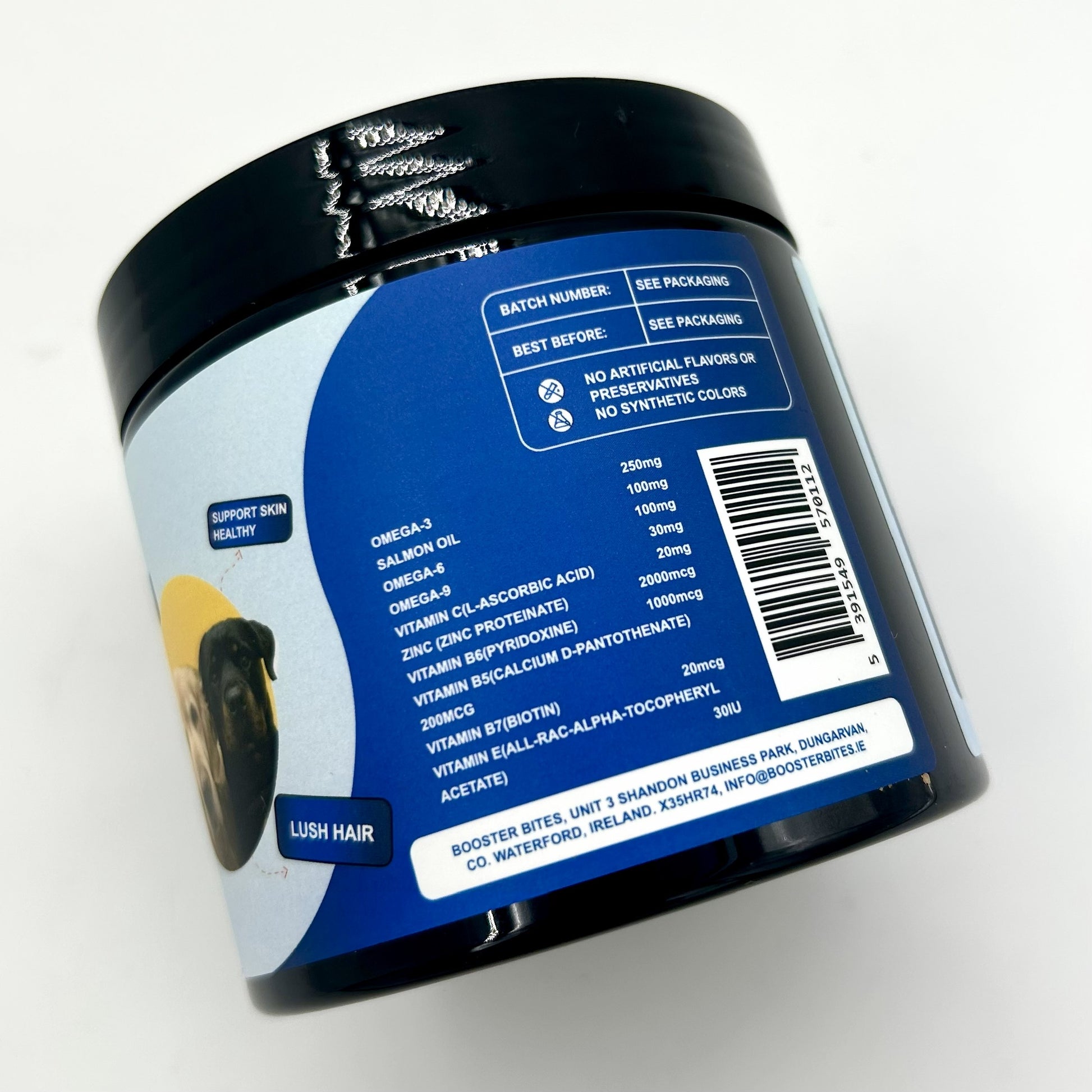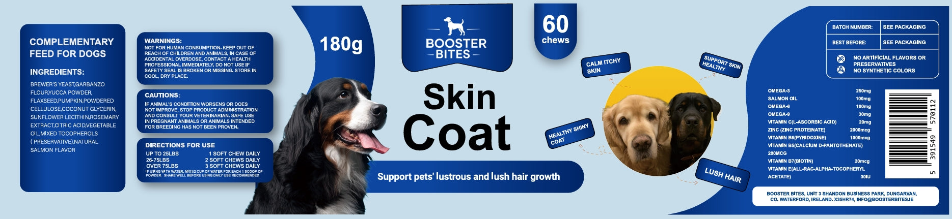 A healthy skin and glossy coat are signs of a happy dog. Booster Bites: Skin & Coat chews are specially formulated to support skin health, reduce dryness and itching, and promote a soft, shiny coat.